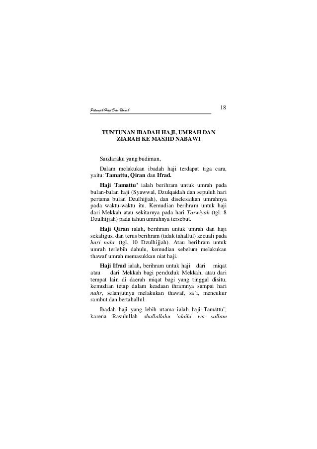 8. memotong rambut atau bulu badan yang lain. sunah haji. adapun sunah haji ada enam perkara, yakni sebagai berikut. 1. cara mengerjakan haji dan umrah. terdapat tiga macam sunah mengerjakan haji dan umrah yaitu sebagai berikut. ifrad : melakukan haji lebih dahulu, kemudian barn umrah. tamattu : mendahulukan umrah, kemudian haji. Mengenai ibadah haji atau umrah yang manakah yang harus kita dahulukan. mengingat kita di indonesia butuh mengeluarkan biaya yang diluar kebiasaan untuk melakukannya berhubung umrah dan haji ini haru dilaksanakan di makkah dan madinah. melihat keadaan calon jama’ah haji di indonesia seperti skrg, dimana seseorang yg telah mempunyai kemampuan. laman (sitemap) awan carian aroma zikir perisian rasulullah umrah hikmah cd hayatus sahabah nabi muhammad tafsir mimpi kekeluargaan haji nasyid imam syafie dvd cinta doa terbaru video